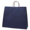 クラフト紙にネイビー色のベタを印刷した手提げ紙袋です。色落ちを緩和させるために、上からニスを塗布しています。